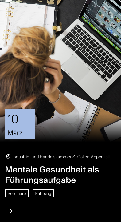 Wir vermitteln Wissen und Methoden zu Ursachen, Signalen und bewährten Bewältigungsstrategien für Führungskräfte. Sie leisten damit einen wichtigen Beitrag zur Sensibilisierung sowie zur Prävention und mentalen Gesundheit Ihrer Mitarbeitenden.